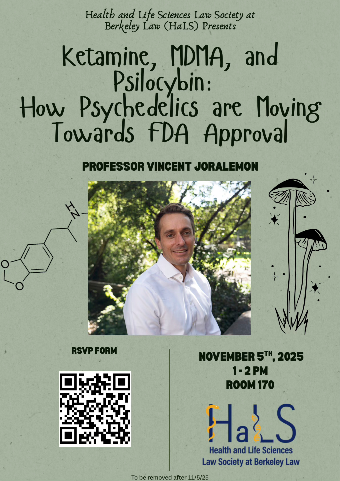 Psychedelic therapies are inching from prohibition toward mainstream care, but access turns on three gates: FDA approval, DEA rescheduling, and insurance reimbursement. This talk, hosted by the new Life Sciences Law & Policy Center Director Vincent Joraelmon, will trace how those gates actually open, using ketamine, MDMA, and psilocybin as case studies. No prior knowledge (or experience) necessary—we’ll provide all of the background you need. Please RSVP here.